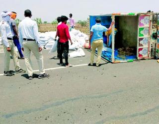 टायर फुटल्याने मालवाहू उलटला