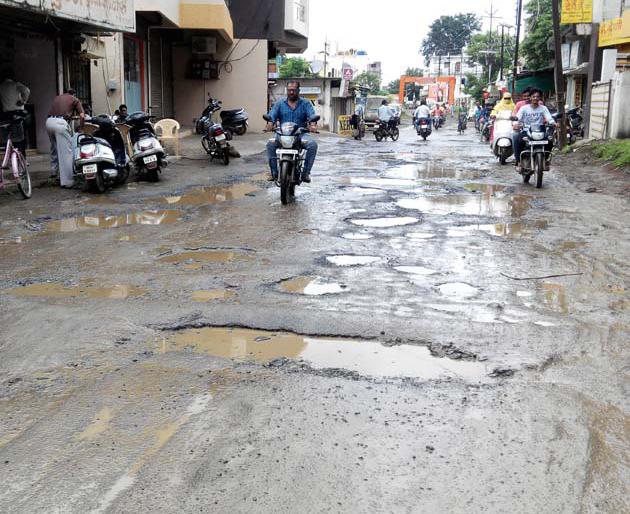 शहरातील हृदयस्थान अशी ओळख असलेल्या वंजारी चौक ते गजानन सायकल स्टोअर्स या रामनगर पोलीस ठाण्याच्या मार्गाची खड्ड्यांमुळे अक्षश: चाळणी झाली आहे.