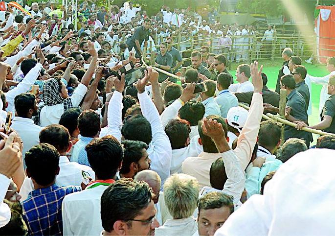 आनंद इंगोले।लोकमत न्यूज नेटवर्कवर्धा : काँग्रेसचे राष्ट्रीय अध्यक्ष राहुल गांधी यांची मंगळवारी पार पडलेली वर्ध्यातील ही दुसरी सभा होती. यापूर्वी सन २०१४ मध्ये लोकसभा निवडणुकीच्यावेळी त्यांची स्थानिक जुन्या आरटीओ मैदानावर जाहीर सभा पार पडली होती. त्यावेळच्या तूलनेत यंदाच्या जाहीर सभेला खा. राहुल गांधी यांच्यासह दिग्गजांचे भाषण ऐकण्यासाठी मोठी गर्दी उसळली होती. यंदा राहुल गांधी यांच्यासह काँग्रेसच्या दिग्गजांनी सर्कस मैदान येथील व्यासपीठावरून केलेले मार्गदर्शन काँग्रेसच्या पदाधिकाºयांसह कार्यकर्त्यांना नवी उर्जा देणारेच ठरले आहे. रात्री उशीरापर्यंत ठिकठिकाणी राहुल गांधींच्या भाषणाची चर्चा होत होती.पदाधिकाऱ्यांनी आॅटोरिक्षातून धरला रस्ताकाँग्रेसच्या पदयात्रेदरम्यान एकच गर्दी झाल्याने काँग्रेसच्या स्थानिक नेत्यांसह कार्यकर्त्यांची तारांबळ उडाली. यादरम्यान काही नेत्यांनी सभास्थळापर्यंत पोहचण्यासाठी आॅटोरिक्षा आधार घेतल्याचे याची देही याची डोळा नागरिकांनी बघितले. तर काहींनी परतीचा प्रवास सायकलरिक्षाने केला.शहरातील गल्लीबोळात वाहनतळराज्यभरातून कार्यकर्त्यांचे वाहने मोठ्या प्रमाणात दाखल झाले होते; पण ही वाहने मिळेल त्या गल्ली-बोळात उभी केल्याने अनेक रस्त्यांना वाहनतळाचे स्वरुप आले होते. रामनगरात जाहीर सभा असल्याने या परिसरातील गल्ल्या व रस्ते वाहनामुळे गजबजून गेले होते. बॅचलर रोडवरही वाहनांची व कार्यकर्त्यांची मोठी गर्दी राहिल्याने सायंकाळी उशिरापर्यंत या मार्गावर वाहतुकीची कोडी कायम होती.नेते पुढे-पुढे कार्यकर्ते मागे-मागेखासदार राहुल गांधी यांची पदयात्रा महात्मा गांधी पुतळ्यापासून निघणार असल्याची माहिती देण्यात आल्याने राज्यभरातून आलेले कार्यकर्ते व पदाधिकारी तेथे दाखल झाले होते; पण वेळेचा विचार करुन ही पदयात्रा इतवारा परिसरातून सुरु करण्याचा निर्णय घेण्यात आला. खा.गांधी हे महात्मा गांधीजींच्या पुतळ्याला अभिवादन करून सुरूवातीला वाहनात बसून पुढे गेले. त्यानंतर डॉ. बाबासाहेब आंबेडकर यांना अभिवादन करुन पदयात्रेत सहभागी होत सर्कस मैदानापर्यंत पायी आले. परंतू सर्वच नेते वाहनातून पुढे निघून गेल्याने कार्यकर्ते मात्र धावपळ करीत त्यांच्या मागे निघाले. काहींनी इतवारापरिसर गाठला तर काहींनी मिळेल तो मार्ग पकडून सर्कस मैदानाचा मार्ग धरला. यात बहूतांश कार्यकर्त्यांना सभेचे ठिकाणच माहिती नसल्याने शहरातच घिरट्या घालत राहीले.