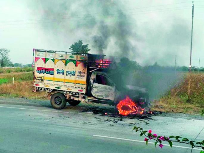 लोकमत न्यूज नेटवर्कसेलू : ऐन पेट्रोलपंपाजवळ भरधाव मालवाहूने अचानक पेट घेतल्याने एकच तारांबळ उडाली होती. ही घटना वर्धा-नागपूर मार्गावर सेलूनजीकच्या एचपीसीएलच्या पेट्रोल पंपाजवळ गुरुवारी सायंकाळी घडली. धावत्या वाहनाने पेट घेतल्याचे लक्षात येताच चालकाने वाहनाबाहेर पळ काढल्याने तो थोडक्यात बचावला. या घटनेमुळे वर्धा-नागपूर मार्गावरील वाहतूक काही काळासाठी खोळंबली होती. अग्निशमन दलाच्या जवानांनी अग्निशमन बंबासह घटनास्थळ गाठून परिस्थितीवर नियंत्रण मिळविले. वर्धा येथे कुटुंबातीलच लग्नसोहळा असल्याने अंधण आणण्यासाठी एम. एच १५ डी. के. ५७४० क्रमांकाचा मालवाहू सिंदी (रेल्वे) येथून वर्ध्याच्या दिशेने जात होता. चालक मंगेश बेलखोडे याने सिंदी येथे वाहनात डिझेल भरले. भरधाव वाहन नागपूर-वर्धा मार्गावरील सेलू नजीकच्या एचपीसीएलच्या पेट्रोल पंपाजवळ आले असता वाहनाचा ब्रेकच लागत नसल्याचे चालकाच्या लक्षात आले.अशातच वाहनाच्या दर्शनीय भागातून धूर निघत असल्याचे निदर्शनास असल्याने चालक थोडा घाबरला. याही परिस्थितीत चालकाने स्वत:ला कसेबसे सावरत वाहन रस्त्याच्या कडेला उभे करून वाहनाबाहेर पळ काढला. बघता बघता आगीने वाहनाला आपल्या कवेत घेतल्याचे लक्षात येताच पोलीस आणि अग्निशमन विभागाला माहिती देण्यात आली. माहिती मिळताच अग्निशमन विभागाच्या जवानांनी अग्निशमन बंबासह घटनास्थळ गाठून परिस्थितीवर नियंत्रण मिळविले.