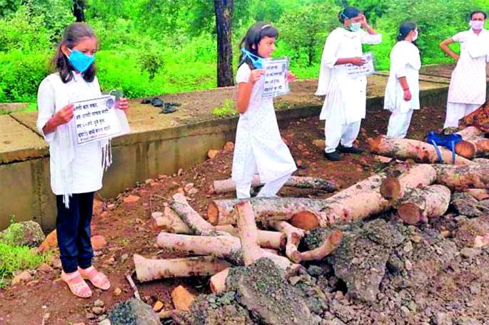 लोकमत न्यूज नेटवर्कसेवाग्राम : सेवाग्राम विकास आराखड्याअंतर्गत वर्ध्यातील विकासकामांकरिता वर्धा ते सेवाग्राम मार्गावरील वृक्षांची मोठ्या प्रमाणात कत्तल केली जात आहे. विकासाच्या नावावर होणारी ही वृक्षतोड थांबविण्यासाठी गांधीवाद्यांसह पर्यावरणप्रेमींनी तोडलेल्या वृक्षासमोर उभे राहून स्वातंत्र्यदिनी वृक्ष बचाव आंदोलन केले. यावेळी हातामध्ये पर्यावरणपूरक संदेश देणारे विविध फलक घेऊन जनजागृती करण्यात आली.सेवाग्राम ते वर्धा या मार्गावरील १६८ मोठी आणि ऐतिहासिक वृक्षांची कत्तल केली जात आहे. यातील बहुतांश वृक्ष महात्मा गांधी, कस्तुरबा गांधी यांच्या कालावधीतील आहे. सेवाग्राम विकास आराखड्याअंतर्गत या मार्गाचे रुंदीकरण करण्यासाठी हे वृक्ष तोडले जात असल्याने गांधीवादी, पर्यावरणप्रेमी तसेच वृक्ष बचाव समितीने एल्गार आंदोलन करून वृक्षतोंड थांबवा; अन्यथा चिपको आंदोलनाचा इशारा दिला. परिणामी, तूर्तास वृक्षतोड थांबवून सर्वेक्षणाला सुरुवात झाली आहे. अशातच या आंदोलनामध्ये नागरिकांचा सहभाग वाढावा आणि वृक्षतोड कायमची थांबावी याकरिता जनजागृती करण्यासाठी स्वातंत्र्यदिनी आंदोलन करण्यात आले.या आंदोलनामध्ये आनंद निकेतन विद्यालयाच्या संचालिका सुषमा शर्मा, ग्रामसेवा मंडळाच्या अध्यक्ष करुणा फुटाणे, डॉ. उल्हास जाजू, डॉ. शिवचरणसिंह ठाकूर, डॉ. प्रभाकर पुसदकर, बहार नेचरचे प्रा. किशोर वानखेडे, डॉ. एस.पी. कलंत्री, डॉ. दिलीप गुप्ता, मुरलीधर बेलखोडे, अशोक डाखोळे, प्रशांत नागोसे, अद्वैत देशपांडे, डॉ. विभा गुप्ता, निरंजना मारू, डॉ. अनुपमा गुप्ता, आरती गगणे, संगीता चव्हाण यांच्यासह सेवाग्राम आश्रम प्रतिष्ठान, नयी तालिम समिती, कस्तुरबा रुग्णालय, ग्रामसेवा मंडळ, मगन संग्रहालय, निसर्ग सेवा समिती, बहार नेचर, राष्ट्रीय युवा संघटनचे पदाधिकारी व कार्यकर्ते आणि आनंद निकेतन विद्यालय, कस्तुरबा विद्या मंदिर, सुशील हिंमतसिंगका विद्यालय, अग्रगामी स्कूल या शाळांमधील विद्यार्थी व शिक्षक तसेच वर्ध्यातील नागरिकही स्वयंस्फू र्तीने सहभागी झाले होते.संदेश देणाऱ्या फलकांनी वेधले लक्षसोशल डिस्टन्सिंगचे पालन करीत सकाळी ८.३० ते ११ वाजतापर्यंत चाललेल्या या जनजागृती आंदोलनामध्ये आंदोलनकर्त्यांनी तोडलेल्या आणि तोडणार असलेल्या झाडापुढे उभे राहून विविध संदेश देणारे फलक झळकावले. या फलकांवर ‘सावली निवारा देऊन बघा, झाडासारखं वागून बघा, कापू नका माझी मुळे, दुष्काळ उभा राही पुढे, प्रगती करू नका, असे आम्ही म्हणत नाही पण, ८० वर्षे जुने वृक्ष फॅक्टरीमध्ये बनत नाही. हवे अहिंसेचे गाव, नको कुºहाडीचे घाव,’ यासारखे असंख्य संदेश लिहिलेले होते.ग्रामपंचायतीपेक्षा ग्रामसभा महत्त्वाची आहे. मग, 