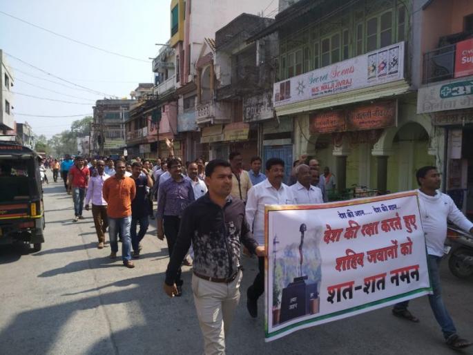 वर्धा - पुलवामा दहशतवादी हल्ल्यात सीआरपीएफचे 40 जवान शहीद झाले. शहीद जवानांमध्ये बुलडाण्यातील दोन जवानांचा समावेश आहे. भ्याड दहशतवादी हल्ल्याचा सर्व स्तरातून निषेध व्यक्त केला जात आहे. याच पार्श्वभूमीवर शनिवारी (16 फेब्रुवारी) बंदची हाक दिली. या बंदला वर्धेकरांनी स्वयंस्फूर्तपणे प्रतिसाद देत शांततेत बंद पाळला. स्थानिक व्यापा-यांनी शनिवारी सकाळी एकत्र येत वर्धा शहरातून शहिदांच्या स्मरणार्थ मोर्चा काढला. मोर्चा कच्छिलाईन येथे पोहोचल्यावर तेथे पुलवामा येथील घटनेत शहीद झालेल्या जवानांना श्रद्धांजली अर्पण करण्यात आली. व्यापा-यांच्या मोर्चाने ‘अमर रहे शहीद, जवान अमर रहे’ अशा घोषणा देत वर्धा शहरातील प्रमुख मार्गाने मार्गक्रमण केले.