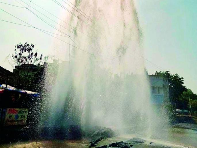 लोकमत न्यूज नेटवर्कवर्धा : नागपूर मार्गावरील नालवाडी परिसरात रस्ता रूंदीकरणाचे काम सुरू आहे. रस्ता रूंदीकरणाच्या खोदकामात शहराला पाणीपुरवठा करणारी मुख्य जलवाहिनी फुटल्याने लाखो लिटर पाणी वाहून गेले. हा प्रकार रविवारी दुपारच्या सुमारास घडला. यामुळे रस्त्याला नदीचे स्वरूप आले होते.शहरासह जिल्ह्यात रस्ता रूंदीकरणासाठी रस्त्याचे खोदकाम जोरात सुरू आहे. डांबरी रस्ते फोडून सिमेंटचे रस्ते करण्याचा सपाटा सुरू आहे. नालवाडी परिसरात असलेल्या डॉ. बाबासाहेब आंबेडकर यांच्या पुतळ्याजवळील रस्त्याचे जेसीबीच्या सहाय्याने खोदकाम सुरू आहे. नालीचे खोदकाम सुरू असताना जेसीबी चालकाच्या निष्काळजीपणामुळे शहराला पाणीपुरवठा करणारी जलवाहिनी फुटली. यामुळे लाखो लिटर पाणी वाया गेले. पाईपलाईनला मोठे भगदाड पडल्याने पाणी रस्त्यावर आल्याने रस्त्याला नदीचे स्वरूप आले होते. पाण्याचा जास्त दबाव निर्माण झाल्याने पाणी वेगाने बाहेर निघून त्याचे कारंजे, तयार झाले होते. सुमारे ७० फुटांपर्यंत हे कारंजे जात असल्याने येथून जाणारे वाहनचालक हे दृश्य पाहत पाहून आश्चर्य व्यक्त करीत होते. अनेकांनी आपल्या मोबाईलमध्ये हे दृष्य टिपले. मात्र, यात लाखो लीटर पाण्याचा अपव्यय झाला. तीन तासांपेक्षा जास्त वेळ या पाईपमधून पाणी वाया जात राहिले. तात्पुरता उपाय म्हणून जेसीबीचालकाने जेसबीचा पंजा फुटलेल्या पाईपच्या जागेवर ठेवण्यात आला. त्यानंतर काही वेळ हे उडणारे कारंजे बंद झाले. मात्र पाणी वाहने चालू होते. रस्ता खोदकामामुळे अनेकांना याचा नाहक त्रास होत असून सदर काम तत्काळ करण्याची मागणी होत आहे.