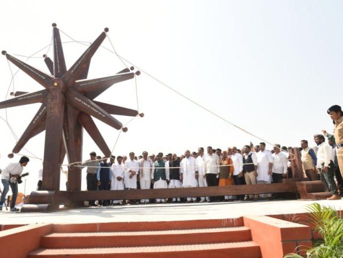 लोकमत न्यूज नेटवर्कवर्धा : सेवाग्राम नजीकच्या वरूड येथे सेवाग्राम विकास आराखड्यातून जगातील सर्वांत उंच चरखा उभारण्यात आला आहे. या चरख्याचे गांधी जयंतीदिनी राज्याचे वित्त नियोजन व वनमंत्री तथा वर्धा जिल्ह्याचे पालकमंत्री सुधीर मुनगंटीवार यांच्याहस्ते लोकार्पण करण्यात आले. या कार्यक्रमाला खासदार रामदास तडस, आमदार डॉ.पंकज भोयर, आमदार समीर कुणावार, जिल्हाधिकारी शैलेश नवाल, जिल्हा पोलिस अधिक्षक डॉ. बसवराज तेली उपस्थित होते.याप्रसंगी मार्गदर्शन करताना ना. मुनगंटीवार म्हणाले की, महात्मा गांधी यांचे सत्य, अहिंसा व शांतता या बाबतचे विचार सर्वांसाठीच प्रेरणादायी असून या शिकवणीचा अवलंब करण्याचा संकल्प सर्वांनी करावा.महात्मा गांधी यांच्या १५० व्या जयंती अभियान निमित्त महात्मा गांधी यांच्या वास्तव्याने पुनित झालेल्या सेवाग्राम येथील सेवाग्राम आश्रम प्रतिष्ठानला पालकमंत्री सुधीर मुनगंटीवार यांनी भेट दिली. पालकमंत्री सुधीर मुनगंटीवार यांनी यावेळी आश्रमातील विविध विभागांना भेट दिली. चरख्यावर सूत कताई केली. यानंतर यात्री निवास येथे महात्मा गांधी यांच्या जीवनावरील विविध आंतराष्ट्रीय चित्रपटांच्या गांधी पॅनोरमा-२०१८ फिल्म फेस्टीवलचे उद्घाटन येथेही पालकमंत्री सुधीर मुनगंटीवार यांनी केले.आश्रमात केली सूतकताईपालकमंत्री सुधीर मुनगंटीवार यांनी बापूकुटीला भेट दिली. यावेळी आश्रम प्रतिष्ठानचे अध्यक्ष टी.आर.एन.प्रभू यांनी सूतमाळेने त्यांचे स्वागत केले. यावेळी मुनगंटीवार यांनी चरख्याजवळ बसून सूतकताई सुद्धा केली.