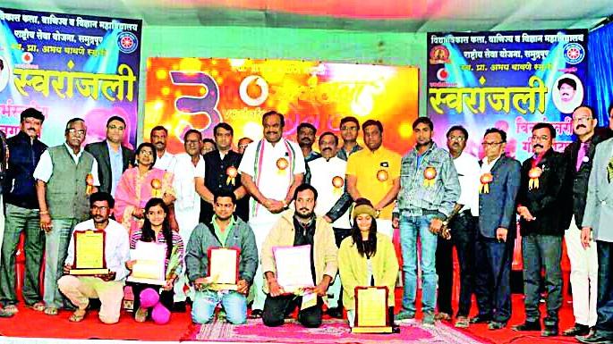 समुद्रपूर : विद्या विकास कला, वाणिज्य व विज्ञान महाविद्यालय समुद्रपूरच्या राष्ट्रीय सेवा योजनेच्यावतीने प्रा. अभय बावणे यांच्या स्मृतीत आयोजित ‘स्वरांजली’ या १९ व्या विदर्भस्तरीय गीतगायन स्पर्धेत यवतमाळचा श्रीकांत टकले प्रथम पुरस्काराचा मनकरी ठरला. तर ब्रह्मपुरीची प्रणाली पाटील व नागपूरची श्रीया मेंढी अनुक्रमे द्वितीय व तृतीय बक्षीसचे मानकरी ठरले.