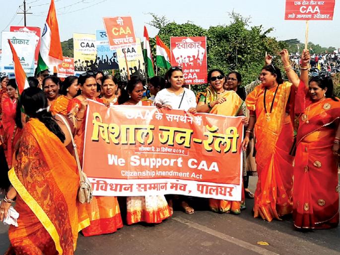 पालघर : राष्ट्रीय नागरिकत्व सुधारणा कायद्याविरोधात मूक मोर्चा काढण्यात आल्यानंतर त्याच्या प्रत्युत्तरात सोमवारी संविधान सन्मान मंचच्या वतीने जिल्हाधिकारी कार्यालयावर संविधान रॅलीचे आयोजन करण्यात येऊन नागरिकत्व संशोधन अधिनियमाला पाठिंबा दर्शवत शक्ती प्रदर्शन करण्यात आले. या वेळी ‘हल्ला बोल हल्ला बोल, नक्षलवाद पे हल्ला बोल, वंदे मातरम्’ अशा घोषणा देत सन्मान संविधान मंचच्या वतीने पालघर सर्कस ग्राउंडमधून हजारोंच्या संख्येने निघालेल्या नागरिकांनी शहर दणाणून सोडले. या वेळी शहरातील बहुतांशी दुकाने बंद होती.या वेळी भाजपाचे माजी राज्यमंत्री रवींद्र चव्हाण, सुधीर दांडेकर, उमेश गायकवाड, या संतोष जनाठे, बाबा कदम, मुकेश दुबे, नगरसेवक भावानंद संखे, अरुण माने, लक्ष्मीदेवी हजारी, भाजप जिल्हाध्यक्ष पास्कल धनारे, उपाध्यक्ष प्रशांत पाटील, अरुण जैन आदी या रॅलीमध्ये उपस्थित होते. जिल्ह्यातून हजारोच्या संख्येने जमलेल्या नागरिकांनी न्या कायद्याला पाठिंबा दर्शविला. देशासाठी अत्यंत आवश्यक असलेल्या आणि लोकसभा व राज्यसभा यांनी पारित केलेल्या व राष्ट्रपती महोदयांनी मंजुरी दिलेल्या कायद्याचे आम्ही समर्थन करतो, असा जयघोष रॅलीमध्ये करण्यात आला. भारतीय राज्यघटनेचे कलम ५१ ए नुसार संविधानाचे पालन करणे आणि त्याचे आदर्श व संस्था यांचा आदर करणे प्रत्येक भारतीय नागरिकांची मूलभूत कर्तव्य आहे. संविधानाद्वारे स्थापित, संसदेने पारित केलेल्या सीएए कायद्याचे हिंसक विरोध करून पोलीस व प्रशासनावर दगडफेक करून सार्वजनिक संपत्ती नष्ट करणे, अशा प्रवृत्तीचा आम्ही निषेध व्यक्त करीत असल्याचे या रॅलीत सांगण्यात आले. पालघर जिल्ह्यात या कायद्याची त्वरित अंमलबजावणी करून घुसखोरांविरुद्ध कायदेशीर कारवाई करण्याची मागणी या रॅलीत करण्यात आली.प्रवाशांचे हालसकाळी १० वाजता रॅली निघणार असल्याने पालघर स्थानकातील एसटी बसेस, सहा आसनी रिक्षा बंद ठेवण्यात आल्या होत्या. त्यामुळे मुंबई, गुजरात दिशेने जाणाऱ्या व येणाºया प्रवाशांना अनेक अडचणींना सामोरे जावे लागले. गावागावात रिक्षा व एसटीची वाट पाहत अनेक प्रवासी उभे होते. तर मुंबईवरून आलेल्या काही प्रवाशांना चालत थेट आपले केळवे गाव गाठावे लागले.