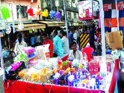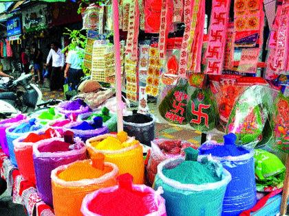 डायमंड स्टीकरला प्राधान्य : रांगोळी व विविध रंग ग्लासमधून दिले जातात. ग्लासची किंमत प्रत्येकी १० रुपये आहे. सोनी भोजिया या विक्रेतीने सांगितले की, रांगोळीच्या स्टीकरची किंमत ३० ते ५० रुपये आहे. स्टीकर्समध्ये विविध प्रकार यंदा पाहायला मिळत आहेत. मोठे स्टीकर १२० रूपयाला आहेत. त्यावर वापरण्यात आलेल्या डायमंडमुळे ते आकर्षक दिसत आहेत. दरवाजाच्या उंबºयावर लावण्यासाठीचे स्टीकर २० ते १०० रूपयांपर्यंत आहेत. डायमंड स्टीकरला ग्राहक अधिक पसंती देत आहेत.