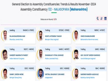 नालासोपारा विधानसभा मतदारसंघात क्षितिज ठाकूर यांना बहुजन विकास आघाडीकडून उमेदवारी देण्यात आली होती. तर, भाजपाने राजन नाईक यांना निवडणूक रिंगणात उतरवले होते. नालासोपारा मतदारसंघात १९ पैकी १८ राऊंड झाले आहेत. यामध्ये भाजपाचे राजन नाईक यांना १ लाख ६४ हजार २४३ मते मिळाली आहेत. तर क्षितिज ठाकूर यांना १ लाख २७ हजार २३८ मते मिळाली आहे. क्षितिज ठाकूर यांच्या विरोधात राजन नाईक यांनी ३७ हजार ००५ मतांची आघाडी घेतली आहे. त्यामुळे राजन नाईक यांची ही विजयी आघाडी असल्याचे सांगितले जात आहे. तर नालासोपारा मतदारसंघात तिसऱ्या स्थानी विनोद मोरे असून, त्यांना १६ हजार ८५६ मते मिळाली आहेत.