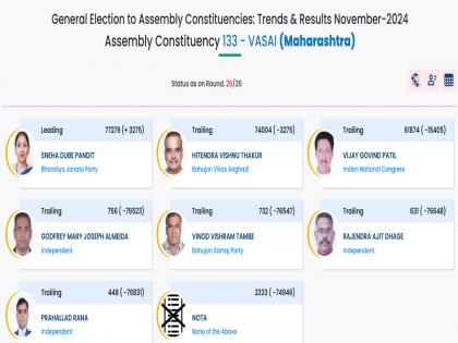 वसई विधानसभा मतदारसंघात हितेंद्र ठाकूर उभे होते. त्यांच्याविरोधात भाजपाने स्नेहा दुबे पंडित यांना उमेदवारी दिली होती. मतमोजणीच्या सगळ्या २६ फेऱ्या पार पडल्यानंतर स्नेहा दुबे पंडित यांना तब्बल ७७ हजार २७९ मते मिळाली. तर हितेंद्र ठाकूर यांना ७४ हजार ००४ मते मिळाली. त्यामुळे ३ हजार २७५ मतांनी स्नेहा दुबे पंडित यांना विजयी आघाडी मिळवली आहे. वसई मतदारसंघात निवडणूक आयोगाकडून स्नेहा दुबे पंडित यांच्या विजयाची केवळ घोषणा होणे बाकी आहे. कारण सगळ्या राऊंडची मतमोजणी झाली आहे. तर वसई मतदारसंघात तिसऱ्या स्थानी असलेल्या विजय गोविंद पाटील यांना ६१ हजार ८७४ मते मिळाली आहेत.