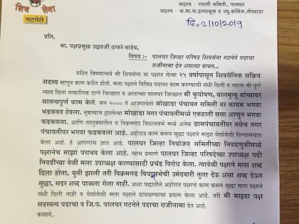 पालघर जिल्हा परिषदेचे शिवसेना गटनेते प्रकाश निकम यांनी आपल्या पदाचा राजीनामा देत असल्याचं पत्र शिवसेना पक्षप्रमुख उद्धव ठाकरेंना दिलं आहे. युती झाली तरी मला विक्रमगड विधानसभा मतदारसंघातून उमेदवारी देण्यात येईल, असा शब्द देण्यात आला होता. मात्र, पक्षनेतृत्वाने तो शब्द पाळला नाही. माझ्यावर वेळोवेळी पक्षाकडून अन्याय झाल्याचं सांगत प्रकाश निकम यांनी उद्धव ठाकरेंकडे आपल्या सर्वच पदांचा राजीनामा पाठवला आहे. शिवसेना पालघर जिल्हा संपर्कप्रमुख रविंद्र फाटक यांनाही याबाबत माहितीची प्रत दिली आहे.