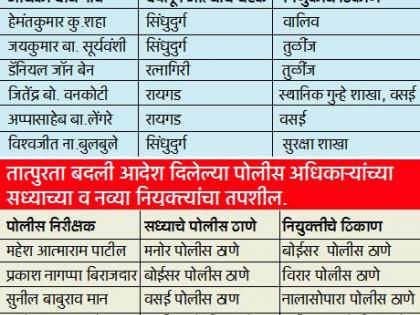 बदली करण्यात आलेल्या अधिका-यांमध्ये ६ पोलीस निरीक्षक, १४ सहायक पोलीस निरीक्षक आणि १४ पोलीस उपनिरीक्षक दर्जाच्या अधिका-यांचा समावेश असून पैकी अन्य ६ पोलीस निरीक्षक दर्जाचे अधिकारी हे सिंधुदुर्ग, रत्नागिरी आणि रायगड जिल्ह्यातून पालघर पोलीस दलात बदली झाल्याची माहिती पोलीस अधीक्षक कार्यालयाच्या जनसंपर्क अधिका-यांनी दिली आहे. तसे लेखी आदेशही पारित करण्यात आले असून बहुतांश अधिकाºयांनी मंगळवारी आपल्या नेमणुकीच्या जागी पदभार स्वीकारला आहे.