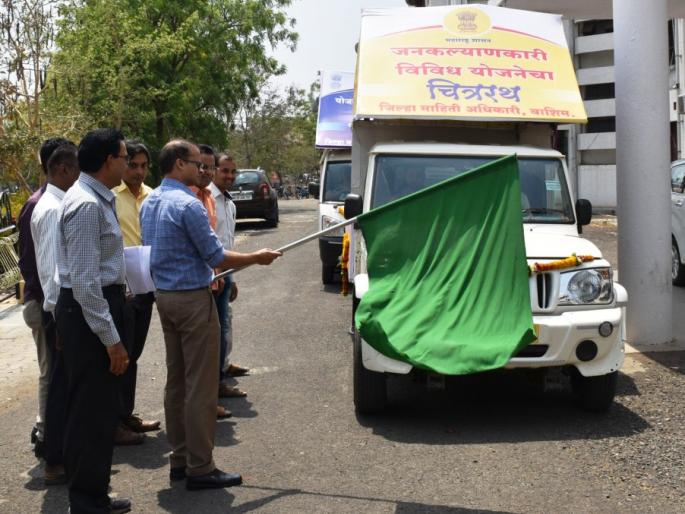 यावेळी जिल्हा पुरवठा अधिकारी देवराव वानखेडे, समाज कल्याण विभागाचे सहाय्यक आयुक्त अनंत मुसळे, जिल्हा महिला व बाल विकास अधिकारी सुभाष राठोड, जिल्हा माहिती अधिकारी हर्षवर्धन पवार, तानाजी घोलप, राजू जाधव, दिलीप काळे आदी उपस्थित होते. चित्ररथाच्या माध्यमातून कृषि अभियांत्रिकीकरण, गाळमुक्त धरण-गाळयुक्त शिवार, महात्मा फुले जन आरोग्य योजना, मुख्यमंत्री ग्राम सडक योजना तसेच डॉ. बाबासाहेब आंबेडकर स्वाधार योजना, डॉ. बाबासाहेब आंबेडकर कृषि स्वावलंबन योजना, कर्मवीर दादासाहेब गायकवाड सबळीकरण व स्वाभिमान योजना आदी योजनांविषयी जनजागृती करण्यात येणार आहे. जिल्ह्यातील ७२ गावांत हा चित्ररथ फिरणार असल्याचे जिल्हा माहिती अधिकारी पवार यांनी यावेळी सांगितले.