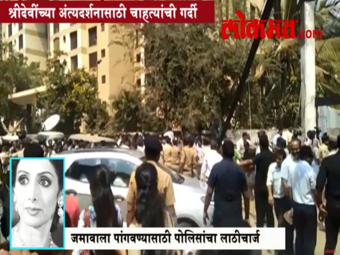 मुंबई, बॉलिवूड अभिनेत्री श्रीदेवी यांच्या पार्थिवाचं अंत्यदर्शन घेण्यासाठी चाहत्यांनी सेलिब्रेशन स्पोर्ट्स क्लब परिसरात प्रचंड गर्दी केलीय गर्दीमुळे कोणताही अनुचित प्रकार घडू नये यासाठी खबरदारी म्हणून जमाव पांगवण्यासाठी पोलिसांना लाठीचार्ज करावा लागला.