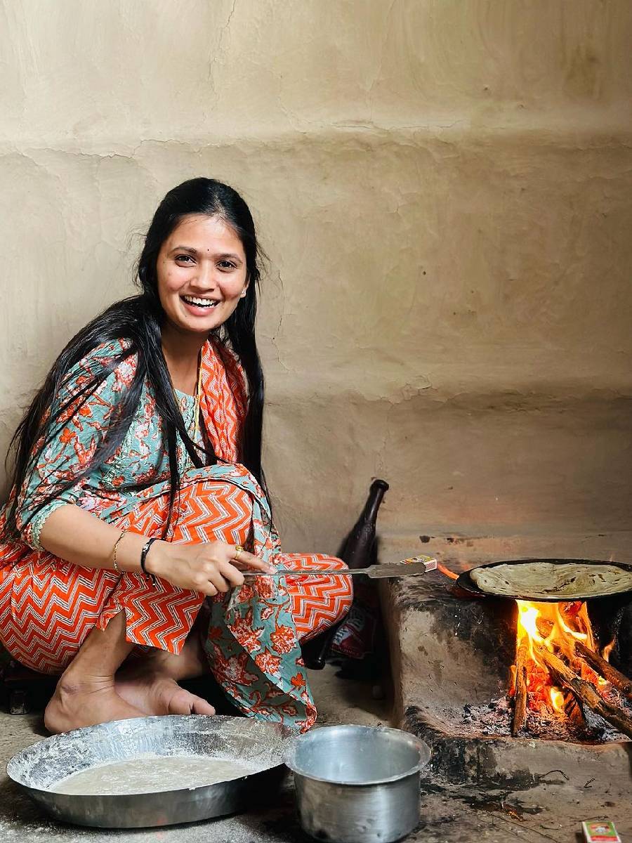 गौतमी चुलीवर भाकरी करत असल्याचे दिसते.