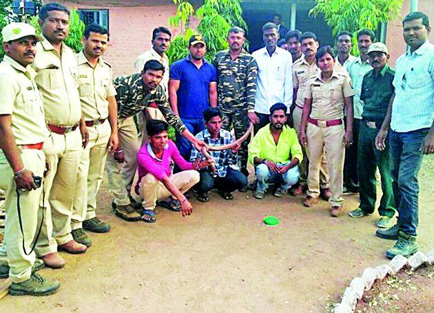 लोकमत न्यूज नेटवर्कआर्णी : सापाची तस्करी करणाºया तिघांना वनविभागाने अटक केली. त्यांच्या जवळून जीवंत साप जप्त करण्यात आला.दिगांबर देवराव कांबळे (४०), लखन गणेश मानकर (२३) रा.मांगुळ आणि अमोल राजू भगत (२५) रा. चांदापूर (भांब) अशी आरोपींची नावे आहे. काही व्यक्ती साप पकडून गुप्तधन काढणाºयांना विकत असल्याची माहिती वनविभागाला मिळाली. त्यावरून वनविभागाने जवळा येथील दिगांबर कांबळे यांच्या घरी धाड घातली. यात एका भरणीत दोन तोंड्या साप (मालन) आढळून आला. त्याची किंमत सहा ते सात लाख रुपये असल्याचे सांगितले जाते. ही कारवाई वनपरिक्षेत्र अधिकारी सी. एस. गावंडे, वनरक्षक ए. पी. श्रीनाथ, नीलेश चव्हाण, दीपक सपकाळे, जी. पी. जाधव, नितीन तांभारे, मारोती जाधव, शिवाजी पैनापल्ले, सदानंद होडगीर, एन.एम. कुरसंगे यांनी पार पाडली. आरोपींविरूद्ध भारतीय वन्यजीव कायद्यानुसार गुन्हा दाखल करण्यात आला.सुकळीत सागवान जप्तजवळा : सुकळी येथे शनिवारी धाड मारून वन विभागाने ५० हजारांचे सागवान जप्त केले. अवैध सागवान कटाई करून फर्निचर विक्री होत असल्याची माहिती वनरक्षक नीलेश चव्हाण यांना मिळाली. त्यांनी वनपरिक्षेत्र अधिकारी सी.एस. गावंडे यांना माहिती दिली. यवतमाळचे फिरते पथक व आणी रेंजच्या वन पथकाने दत्ता मोरे यांच्या घरी धाड घालून सागवान जप्त केले. याप्रकरणी नंदू संजय मोरे (२४) याला अटक करण्यात आली. सहआरोपी दत्ता मोरे फरार झाला.