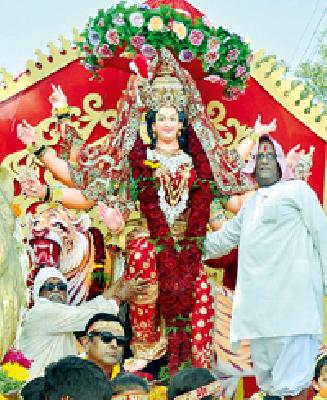 विमानातून पुष्पवृष्टीयवतमाळ : ढोलताशांच्या गजरात, गुलालाची उधळण करीत माँ दुर्गेचे आगमन झाले आणि यवतमाळच्या प्रसिद्ध दुर्गोत्सवाला प्रारंभ झाला. विमानातून करण्यात आलेली पुष्पवृष्टी आणि विविध प्रांतातील परंपरागत नृत्याने माँ दुर्गेचे स्वागत करण्यात आले. यवतमाळ शहर माँ दुर्गेच्या स्वागतासाठी सज्ज होते. सकाळपासून भक्तांचे लोंढे यवतमाळात येत होते. विविध मंडळांनी मिरवणुका काढून देवीची स्थापना केली. यवतमाळातील आर्णी मार्ग, लोखंडीपूल परिसर, पॉवर हाऊस, वडगाव आणि माळीपुरात मंडळांनी देवी नेण्यासाठी गर्दी केली होती. सुवर्ण महोत्सवी वर्ष साजरे करणाऱ्या बालाजी चौकातील दुर्गोत्सव मंडळाने शोभायात्रेवर विमानातून पुष्पवृष्टी केली. विविध मंडळांच्या शोभायात्रेत प्रबोधनात्मक फलक लावण्यात आले होते. बेटी बचाव यासह इतर विषयावर पथनाट्य सादर करण्यात आले. दिवसभर आणि रात्री उशिरापर्यंत ढोलताशांचा गजर सुरूच होता. कडाडणारे ढोलताशे अन् परंपरागत लोकनृत्ययवतमाळ : कडाडणारे ढोलताशे, गुलालांची उधळण, जय माता दीचा गजर आणि विविध प्रांतातील लोककलेचे दर्शन घडविणाऱ्या नृत्य आदींनी यवतमाळकरांच्या डोळ्याचे पारणे फेडले. यवतमाळच्या प्रसिद्ध दुर्गोत्सवानिमित्त विविध मंडळांनी शोभायात्रा काढून माँ दुर्गेचे विधिवत स्थापना केली. सुवर्ण महोत्सव साजरे करणाऱ्या बालाजी दुर्गोत्सव मंडळाची शोभायात्रा सर्वाधिक लक्षवेधक होती. यवतमाळ शहरातील दुर्गोत्सव म्हणजे जिल्ह्यासाठी पर्वणी असते. विविध देखावे आणि कार्यक्रमांसाठी हा दुर्गोत्सव प्रसिद्ध आहे. मंगळवारी घटस्थापनेनिमित्त शहरातून निघालेल्या दुर्गोत्सवाने यवतमाळकरांच्या डोळ्याचे पारणे फेडले.बालाजी चौकातील दुर्गोत्सव मंडळाने हिमालयाची विशाल प्रतिकृती साकारली असून त्याच तोडीची स्थापनेनिमित्त मिरवणूक काढण्यात आली होती. या मिरवणुकीचे वैशिष्ट्य म्हणजे विविध प्रांतातील लोकनृत्य सादर करणारे कलावंत होय. सजविलेल्या बैलगाडीवर सनई चौघडा वाजविणारे कलावंत नागरिकांचे लक्ष वेधत होते. लेझीम पथक, पोतराज, गोंधळी नृत्य, मणिपुरी नृत्य, राजस्थानी नृत्य, मयूर नृत्य, कुचीपुडी नृत्य यासह विविध नृत्य कलावंतांनी सादर केले. शहराच्या प्रमुख मार्गावरून ही मिरवणूक मार्गक्रमण करीत होती. त्यावेळी विमानातून पुष्पवृष्टी केली. येथील आझाद मैदानावर स्थापन करण्यात येणाऱ्या गुजरात नवरात्रोत्सव मंडळाची शोभायात्राही लक्षवेधक होती. भाविकांनी पारंपरिक गुजराती पद्धतीने वेशभूषा केली होती. तर आदिवासी वेशभूषेतील कलावंत नृत्य सादर करीत होते. ढोल-ताशा रॉक बॅन्डच्या सोबतीला परंपरागत वाद्यही होते. वडगावच्या सुभाष क्रीडा मंडळाने महाराष्ट्री