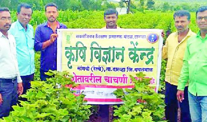 लोकमत न्यूज नेटवर्कदारव्हा : तालुक्यातील बोथ येथे कृषी विज्ञान केंद्राच्या शास्त्रज्ञांनी भेट देऊन शेतकऱ्यांना गुलाबी बोंडअळीबाबत मार्गदर्शन केले. यावेळी एकात्मिक कीड व्यवस्थापनाचे महत्त्व समजावून सांगण्यात आले.कृषी विज्ञान केंद्राचे डॉ.विपुल शहा, विस्तार अधिकारी वासुदेव चांदुकर, शेतकरी रामकृष्ण गावंडे, पवन काळे, गोपाल गावंडे, अशोक ठाकरे, संतोष वानखडे यावेळी प्रामुख्याने उपस्थित होते. डॉ.शहा यांनी मार्गदर्शन केले.शेतकऱ्यांनी गुलाबी बोंडअळीबाबत जागृत राहून निरीक्षण करावे, एकात्मिक कीड व्यवस्थापनात गुलाबी बोंडअळीग्रस्त फुले तोडून अळीसह नष्ट करावी. एकरी पाच ते सहा कामगंध सापळे लावावे. निंबोळी अर्काची फवारणी करावी. पात्यांच्या अवस्थेपासून एकरी तीन ट्रायकाकार्डचा वापर करावा. वातावरणात पुरेशी आर्द्रता असताना ब्युव्हेरीयाबँसीयाना या जैविक बुरशीनाशकाची ५० ग्रॅम प्रति १० लिटर पाण्यात फवारणी करावी. तसेच बांधावर असणाऱ्या किडींच्या पर्यंयी खाद्य वनस्पती अंबाडी, रानभेंडी नष्ट कराव्या. शेतात एकरी १५ ते २0 पक्षी थांबे लावावे, अशी माहिती त्यांनी दिली. यावेळी गावातील शेतकरी उपस्थित होते.