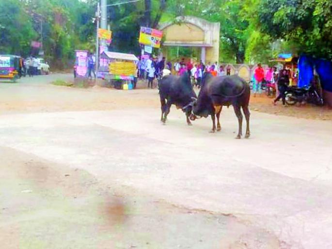 लोकमत न्यूज नेटवर्कयवतमाळ : नवीन बसस्थानक परिसरासह शहरात मोकाट जनावरांनी हैदोस घातला आहे. जनावरे रस्त्यांवर ठिय्या मांडून बसतात. त्यामुळे वाहतुकीची कोंडी होत आहे.येथील बसस्थानकाचे नवनिर्माण केले जात आहे. त्यासाठी बसस्थानक आर्णी मार्गावर हलविण्यात आले आहे. त्यामुळे आर्णी मार्गावर वाहतूक वाढली आहे. बसस्थानकात प्रवासी सोडण्यासाठी अनेक वाहने आर्णी मार्गाने धावतात. बसस्थानकाशेजारी अनेक व्यावसायिकांनी दुकाने थाटली. या परिसरात रस्ता अरुंद आहे. त्यामुळे नेहमी वाहतुकीची कोंडी होते. प्रवासी वाहने रस्त्याच्या कडेला उभी राहात असल्याने प्रवाशांना त्रास सहन करावा लागतो. तसेच वाहनधारकांनाही कसरत करीत मार्गक्रमण करावे लागते.बसस्थानक परिसरातच आयुर्वेद महाविद्यालय आहे. या रस्त्याने विद्यार्थ्यांची नेहमी गर्दी असते. याच परिसरात अनेक दवाखाने, शिकवणी वर्गही आहे. अनेक विद्यार्थी ये-जा करतात. त्यांनाही वाहन काढताना कसरत करावी लागते. सोमवारी सकाळच्या सुमारास आयुर्वेदिक कॉलेजसमोरच दोन सांडांची टक्कर झाली. यावेळी काही काळ वाहतूक ठप्प झाली होती. त्यामुळे प्रवाशी व इतर वाहनधारकांना नाहक मनस्ताप सहन करावा लागला. या मार्गावर नेहमी मोकाट जनावरांचाही हैदोस असतो. विशेष म्हणजे, बसस्थानक परिसरातच मांस विक्रीची अनेक दुकाने असल्याने प्रवाशांना त्रास सहन करावा लागतो. नेहमी वाहतूक विस्कळीत होत असल्याने या मार्गावर वाहनांच्या रांगा लागलेल्या असतात. यामुळे नागरिकांनाही त्रास होतो.अतिक्रमण हटाओ मोहिमेचा केवळ फार्सशहरात वारंवार अतिक्रमण हटाओ मोहीम राबविली जाते. मोहिमेतील यंत्रे समोर गेल्यानंतर लगेच जैसे थे परिस्थिती निर्माण होते. अनेक व्यावसायिक पुन्हा आपली दुकाने थाटतात. ही मोहीम कायमस्वरूपी सुरू राहणे गरजेचे आहे. मात्र संबंधित विभाग केवळ फार्स म्हणून मोहीम राबवित असल्याची ओरड नागरिकांमधून होत आहे. आर्णी मार्गावर तात्पुरते बसस्थानक झाल्याने या मार्गावरील दोन्ही बाजूंचे अतिक्रमण कायमस्वरूपी काढण्याची अपेक्षा व्यक्त केली जात आहे. संबंधित विभागाने याकडे लक्ष देण्याची गरज आहे.