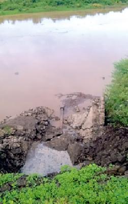 दरड कोसळली : सिंचनाचे टाके भुईसपाटमुळावा : परिसरात शनिवारी पहाटे ३ ते ५ वाजेपर्यंत मुसळधार पाऊस पडला. त्यामुळे पैनगंगा नदी दुथडी भरून वाहू लागली. नदी पात्राच्या वेगवान प्रवाहामुळे दरड ढासळल्याने उपसा सिंचन योजनेंतर्गत बांधण्यात आलेले टाके पूर्णत: भुईसपाट झाले. सन १९७५ साली तिवरंग येथे उपसा सिंचन योजनेतून हे टाके बांधण्यात आले. त्यात ४० अश्वशक्तीचे दोन पंप बसविण्यात आले असून आळीपाळीने हे पंप सुरू करण्यात येतात. परंतु १० वर्षांपासून ही योजना बंद आहे. वसंत सहकारी साखर कारखान्याने उमरखेड तालुक्यातील आठ उपसा सिंचन योजना शासनाकडून विकत घेतल्या. परंतु कारखाना प्रशासनाला नियोजन न जमल्याने सर्व योजना सध्या बंद आहेत. नदी पात्रापासून ५० फूट उंचावर हे टाके होते. मात्र पुरामुळे दगडी बांधकाम असलेले टाके कोलमडून पडले. त्यामध्ये लोखंडी पाईप व दोन मोटारपंप ढिगाऱ्याखाली दबले आहे. सुमारे दीड वर्षांपासून नदीत पाणी नव्हते. त्यामुळे पूर पाहण्यासाठी गावकऱ्यांची गर्दी जमली होती. शेतकऱ्यांना दिलासा मिळाला आहे. (वार्ताहर)