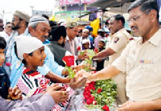 ईद उत्साहात : सौहार्द वाढविण्यासाठी पोलिसांनी दिले गुलाबपुष्पयवतमाळ : रमजान ईदच्या पर्वावर समाजबांधवांनी जिल्ह्यात मुबलक पाऊस, समृद्धी आणि शांती नांदावी म्हणून ठिकठिकाणी प्रार्थना केली. यावेळी सर्व समाजबांधवांनी मुस्लिम बांधवांना ईदच्या शुभेच्छा दिल्या. तर जातीय सलोखा कायम राहावा आणि सौहार्द वाढावा म्हणून पोलीस विभागाने मुस्लिम बांधवांना गुलाबपुष्प देऊन स्वागत केले. यवतमाळ शहरातील इदगाह मैदानावर जामा मशिदचे इमाम मौलाना याकूब यांनी ईदेचा नमाज अदा केला. यावेळी असंख्य समाजबांधव उपस्थित होते. यावेळी मौलानांनी रमजानचे महत्त्व समजावून सांगितले. दुसऱ्यांच्या सुख-दु:खात सामील होण्यासाठी पुढे येण्याचे आवाहनही केले. पाऊस, समृद्धी आणि शांतीची प्रार्थना करण्यात आली. या ठिकाणी समाजबांधवांनी एकमेकांना ईदेच्या शुभेच्छा दिल्या. स्थानिक कळंब चौकात सर्वच समाजबांधवांनी मुस्लिम बांधवांना ईदच्या शुभेच्छा दिल्या. इतकेच नव्हे तर, पोलीस अधीक्षक अखिलेश सिंग यांच्या सूचनेनुसार उपविभागीय अधिकारी राहुल मदने, ठाणेदार मुकुंद कुलकर्णी, बाळकृष्ण जाधव, दिलीप चव्हाण यांनी मुस्लिम बांधवांना गुलाबपुष्प देऊन ईदेच्या शुभेच्छा दिल्या. जिल्ह्यात सर्वत्र ईद उत्साहात साजरी झाली. (शहर वार्ताहर)