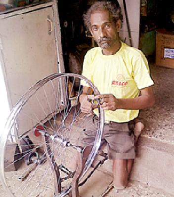 गणेश रांगणकर नांदेपेरायेथून सहा किलोमीटर अंतरावरील मारेगाव तालुक्यातील वनोजादेवी येथील अपंग सुरेशने जिद्दीने आपल्या अपंगत्वार मात करून जीवन जगण्याची कला हस्तगत केली आहे. आपल्या अपंगपणाचा कुठेही ढिंढोरा न पिटता त्याने स्वत:च्या पायावर उभे राहून आपला उदरनिर्वाहाचा मार्ग शोधला आहे. वनोजादेवी या गावात अत्यंत गरीब परिस्थितीतील गाडगे कुटुंबात सुरेशचा जन्म झाला. तानबाजी गाडगे त्याचे वडील. त्याला आई-वडिलांसह एक भाऊ, एक बहीण आहे. जन्मताच सुरेश दोन्ही पायांनी अपंग होता. मात्र अपंग असूनही त्याने गावातील शाळेत सातवीपर्यंत प्राथमिक शिक्षण पूर्ण केले. मात्र नंतर गावात माध्यमिक शाळा नव्हती. गावापासून जवळपास सहा किलोमीटर अंतरावर नांदेपेरा येथे माध्यमिक शाळा होती़ तथापि सुरेश अपंग असल्याने त्याला नांदेपेरा येथील शाळेत दररोज कसे पोहोचावे, असा प्रश्न पालकांपुढे पडला. सुरेशला पुढील माध्यमिक शिक्षण मिळते किंवा नाही, अशी परिस्थिती निर्माण झाली. वडील पेचात सापडले. मात्र अपंग सुरेशची शिकण्याची जिद्द व चिकाटी वाखाणण्याजोगी होती. कोणतयाही स्थितीत पुढील शिक्षण घ्यायचेच, असा चंगच त्याने बांधला होता. त्यामुळे शेवटी त्याच्या वडिलांनी त्याला नांदेपेरा येथील पंचशील हायस्कूलमध्ये आठवीत दाखल केले़ मात्र सुरेशचा शाळेत जाण्यााच प्रश्न कायमच होता. या स्थितीत त्याचे काही मित्र समोर आले. ते दररोज त्याला वनोािदेवी येथून आपल्या सायकलवर मागे बसवून शाळेत नेऊ लागले. शिक्षणाच्या जिद्दीने आणि मित्रांच्या सहकार्याने अखेर सुरेशने तेथे दहावीपर्यंत आपले शिक्षण पूर्ण केले़ परंतु दररोज मित्रांच्या सायकलवर मागे बसून येताना, त्याचे विचारचक्र सुरू असे. सायकल कशी तयार झाली असेल, चाके कशी फिरत असतील, आदी प्रश्न त्याच्या मनात घर करून होते. त्यामुळेच मित्राच्या सायकलला पंक्चर किंवा इतर बिघाड झाल्यास सुरेश तो दुरूस्त करण्याचा प्रयत्न करीत होता़ याच प्रयत्नातून त्याने मनात खूणगाठ बांधली. दहावीनंतर त्याचे शिक्षण रखडले अन् त्याने आपल्या कुटुंबाला मदत करण्यासाठी गावातच मिळेल तेथे सायकल पंक्चर दुरूस्तीचे काम सुरू केले. प्रथम त्याला नीट काम येत नव्हते. प्रचंड इच्छाशक्तीच्या बळावर त्याने पूर्ण काम शिकून घेतले. गावात कुठेही तो पंक्चर दुरुस्ती करायचा. गरीब परिस्थितीमुळे त्याला दुकान लावणे अशक्य होते. दरम्यान वणीतील विनोद मुत्यलवार यांनी त्याला सायकल दुरूस्ती करताना बघितले़ अपंग सुरेशची जिद्द, चिकाटी, काम करण्याची कला बघून ते अचंबित झाले. त्यांनी सुरेशला आपल्या वणी येथील दुकानात काम करतो का ?, अशी विचारणा केली. तेव्हा सुरेशचा आनंद गगनात मावेनासा झाला. ग्रामीण भागापेक्षा शहरात