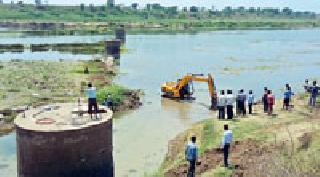 पाण्यासाठी हाहाकार : शुक्रवारी सकाळी बल्लारपुरातील वर्धा नदीवरील महाराष्ट्र जीवन प्राधिकरणाच्या विहिरीतील शाफ्ट तुटल्यामुळे नळधारकांना पाणी पुरवठा होऊ शकला नाही. विहिरीजवळील गाळ जेसीबीद्वारे काढताना पालिकेचे कर्मचारी.