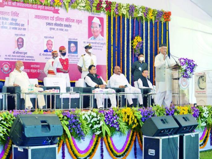 राज्यपाल म्हणाले, ‘लेकी बोले, सुने लागे’- विजय दर्डा यांनी राज्यपालांकडे यवतमाळच्या विकासाबाबतचे विविध प्रश्न मांडले. पालकमंत्री संदीपान भुमरे यांनी या सर्व प्रश्नांची दखल घेत त्याबाबतची घोषणाही भाषणातून केली. याच मुद्द्यावर भाष्य करताना राज्यपाल भगतसिंह कोश्यारी म्हणाले की, यवतमाळचे प्रश्न माझ्याकडे विजय दर्डा यांनी मांडले असले तरी मी काही करू शकत नाही, हे त्यांनाही माहीत आहे. मात्र, ‘लेकी बोले, सुने लागे’ अशा तऱ्हेने हे प्रश्न सरकार दरबारी पोहोचविण्यासाठी त्यांनी मांडले. त्यावर उपस्थित असलेल्या पालकमंत्री संदीपान भुमरे यांनी पाच कोटींच्या निधीची तत्काळ घोषणाही केली आहे. विजय दर्डा यांनी मांडलेला नर्सिंग महाविद्यालयाचा विषय ते विसरले असतील; परंतु पालकमंत्री तेही काम करतील, असा विश्वास आहे, असे सांगत गडकरी यांच्याशी तुमचे चांगले संबंध आहेत. तुम्ही त्यांच्या शेजारीच राहता, त्यामुळे त्यांच्यामार्फतही यवतमाळच्या विकासाचे काही प्रश्न मार्गी लावू शकता, असेही राज्यपाल कोश्यारी यांनी विजय दर्डा यांना सांगितले.